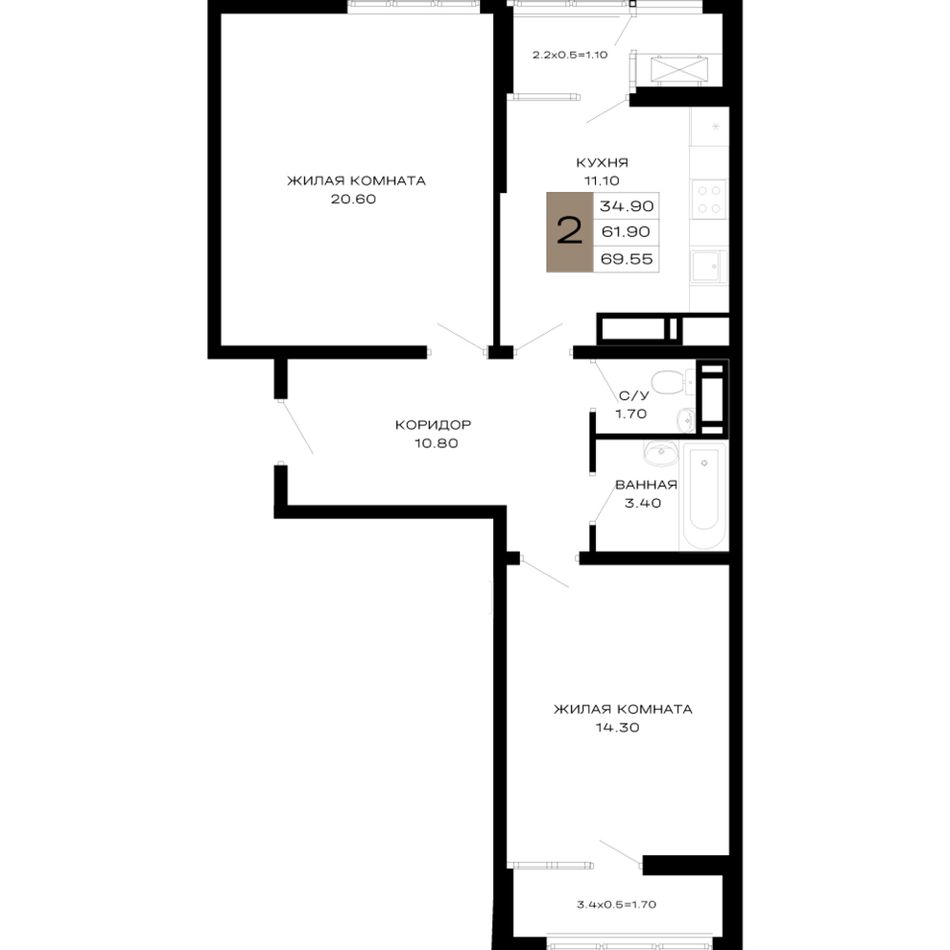 2-комнатная — 65,55 м² 6/23 эт. в Дом 101