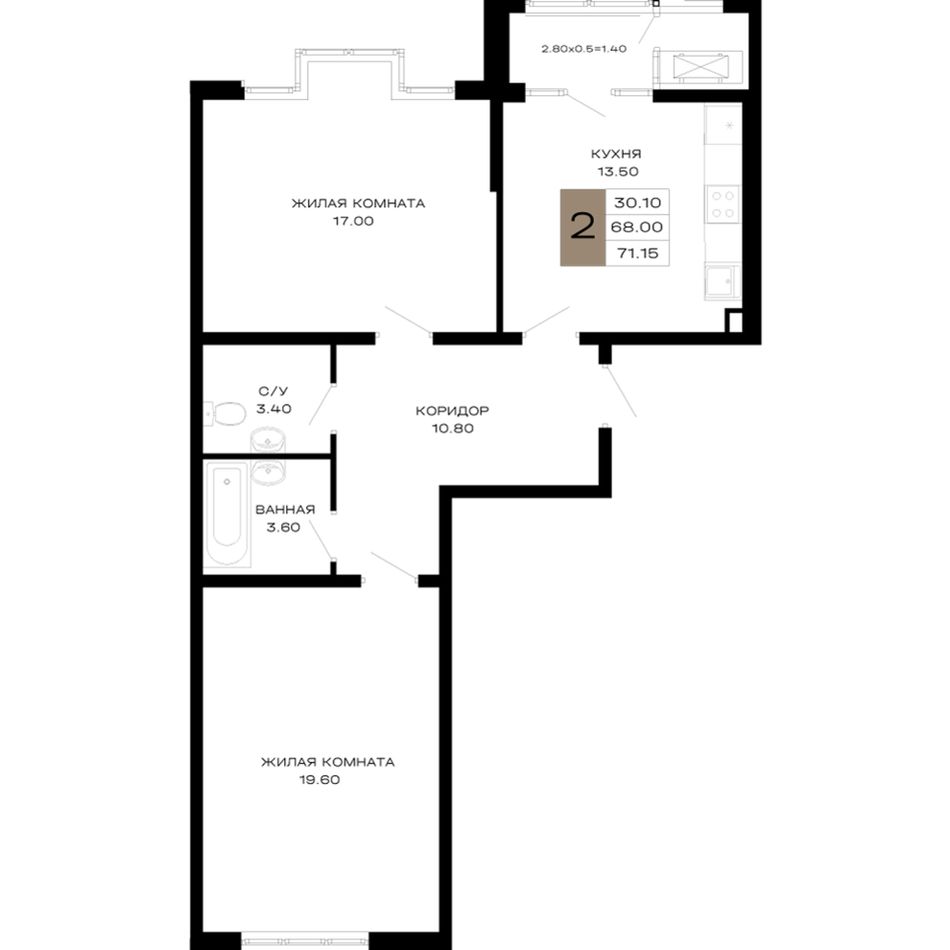 2-комнатная — 70,2 м² 3/23 эт. в Дом 101