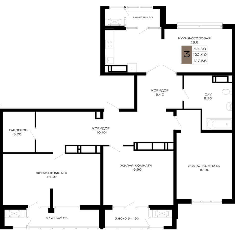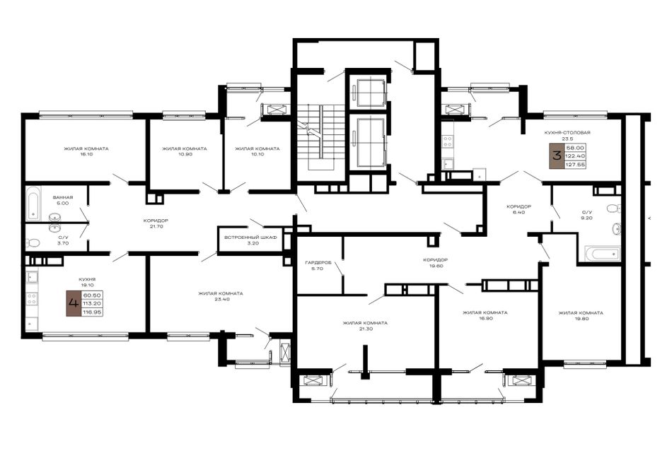 3-комнатная — 127,55 м² 19/23 эт. в Дом 101