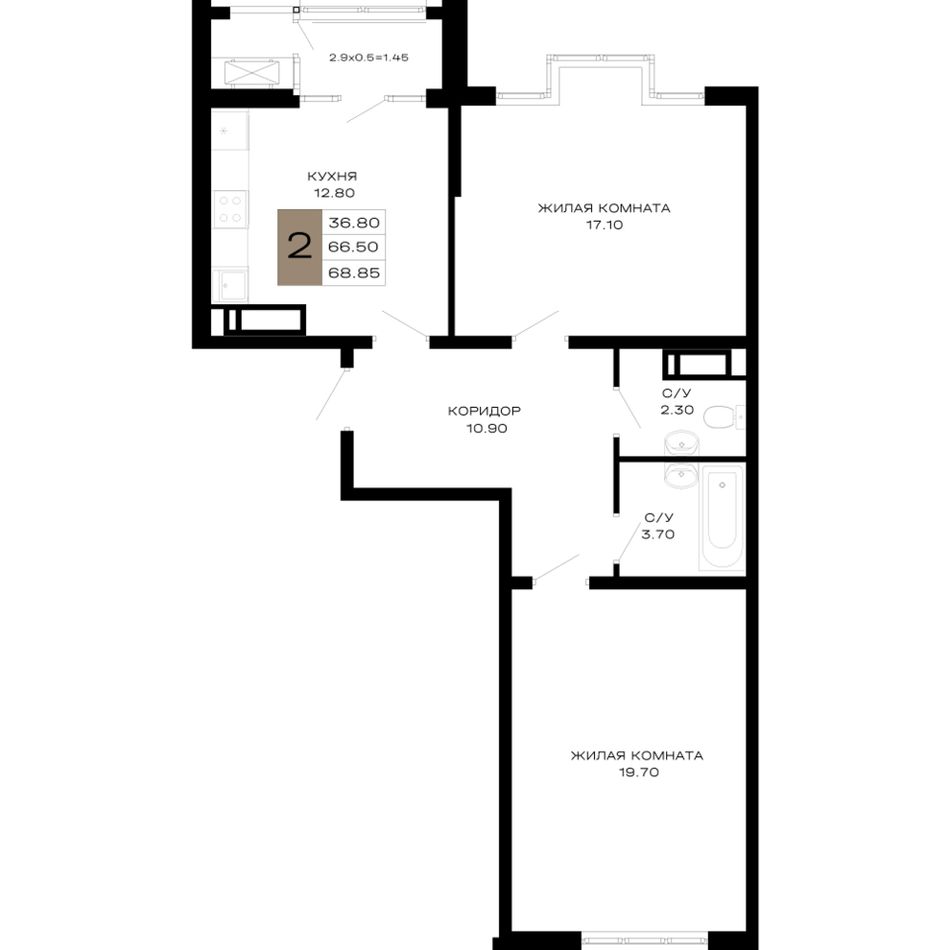 2-комнатная — 68,85 м² 10/23 эт. в Дом 101