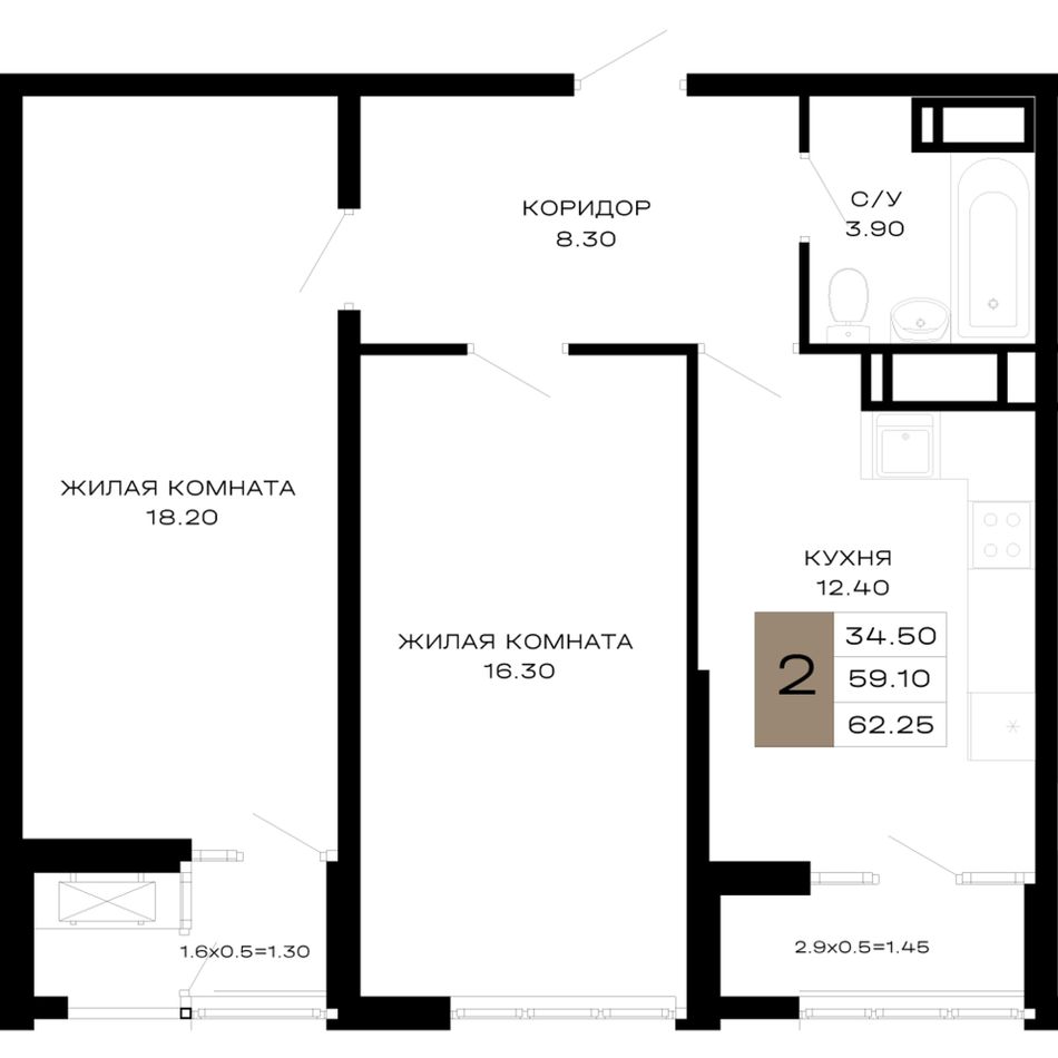 2-комнатная — 62,25 м² 4/23 эт. в Дом 101