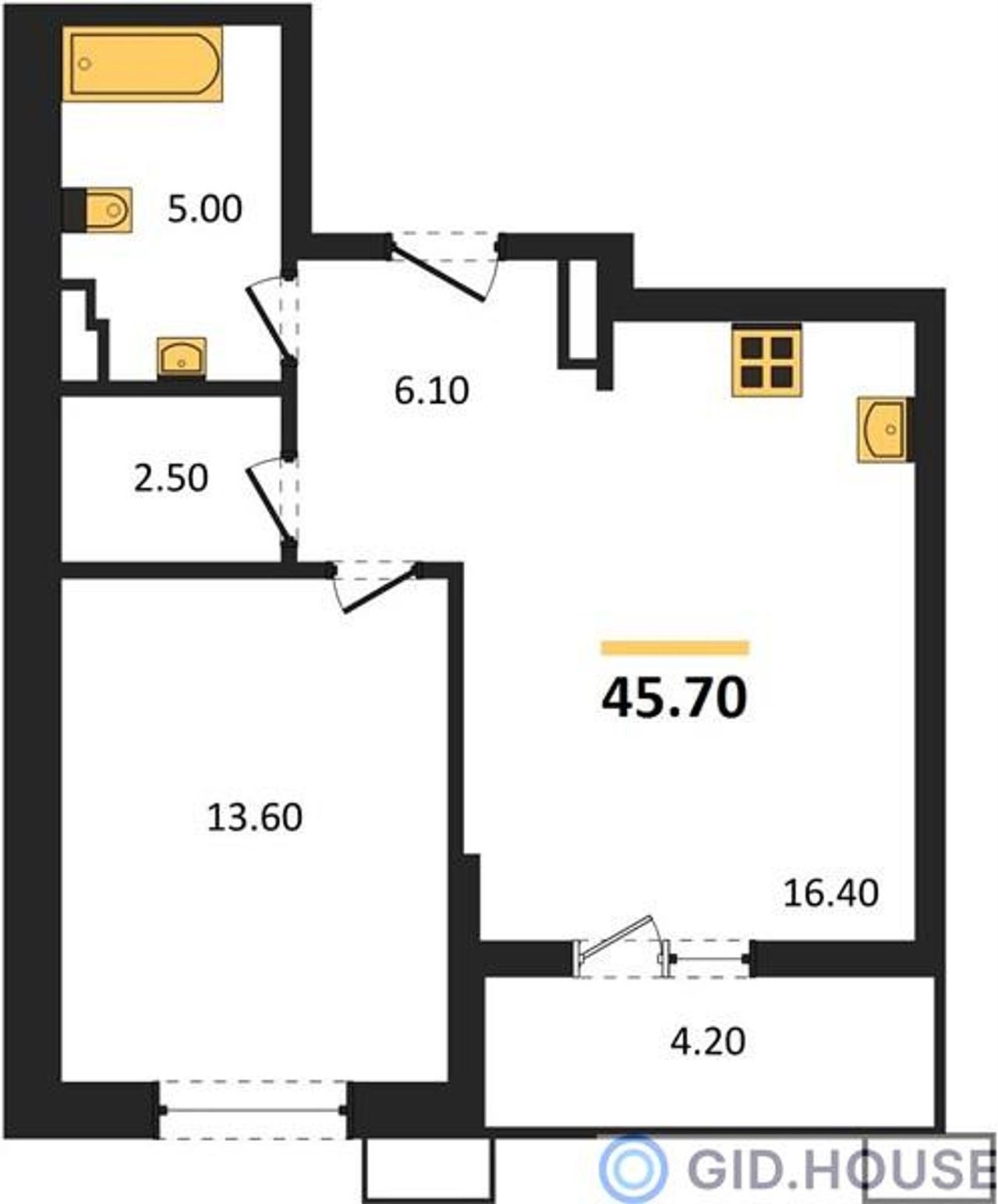 1-комнатная — 45,7 м² 7/9 эт. в Краски