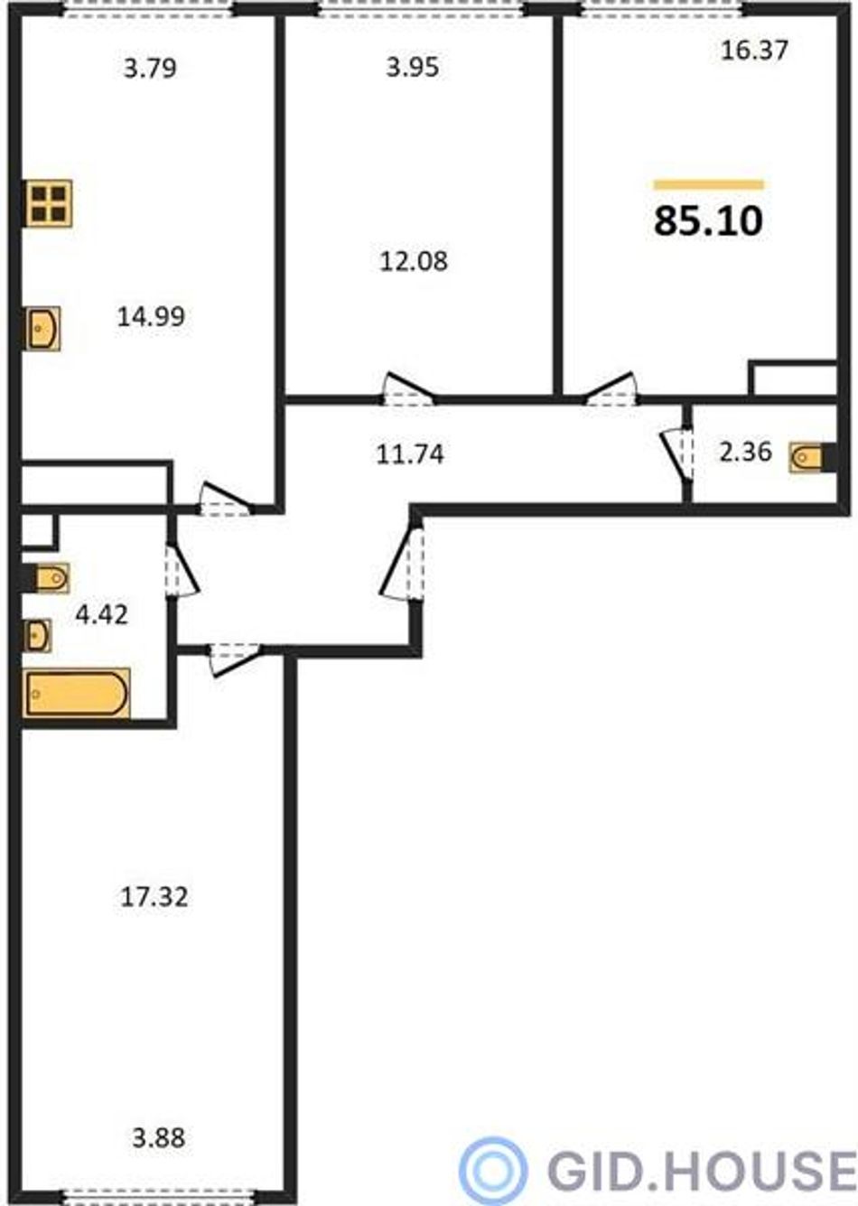 3-комнатная — 85,43 м² 22/24 эт. в Гарантия на Обрывной