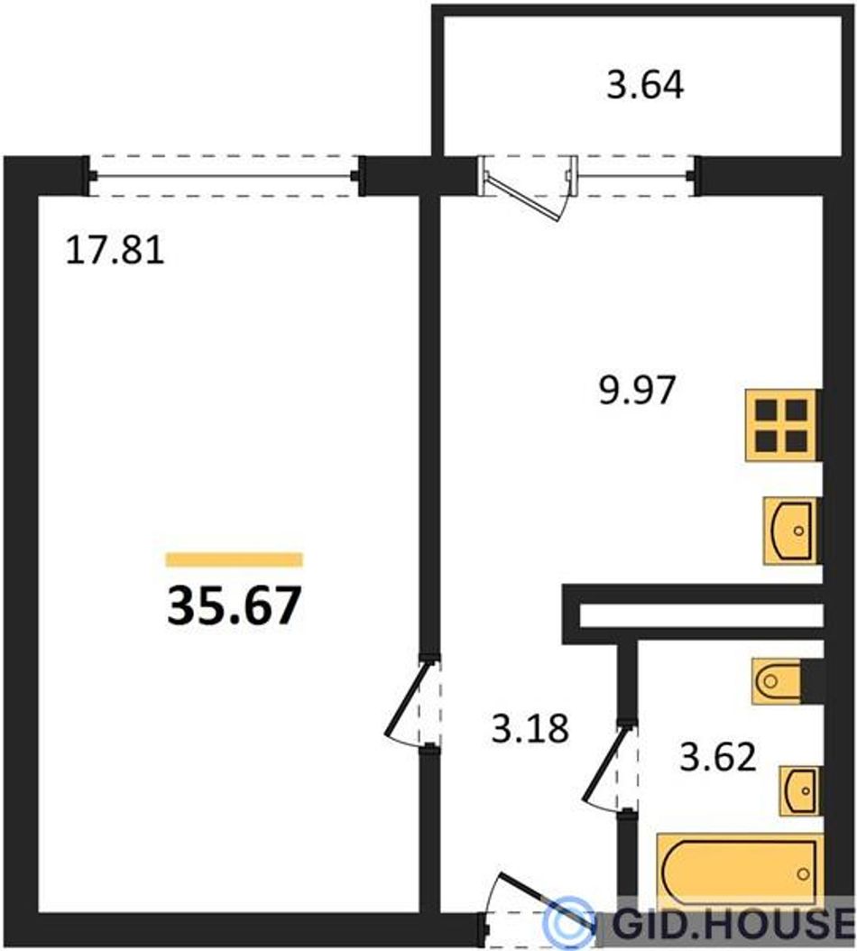 1-комнатная — 35,67 м² 1/5 эт. в Суворовский