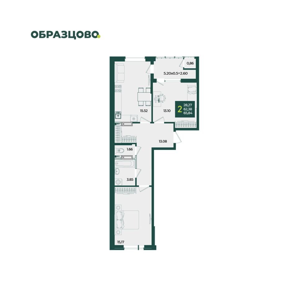 2-комнатная — 65,84 м² 18/18 эт. в Любимово