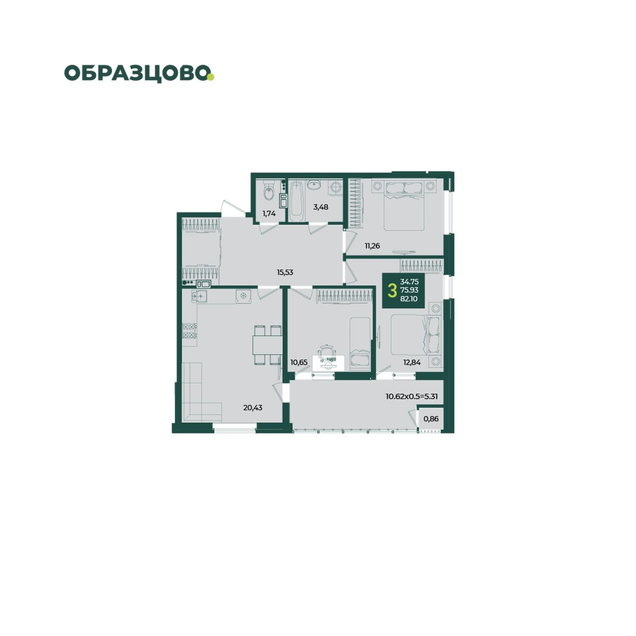 3-комнатная — 82,1 м² 3/18 эт. в Любимово