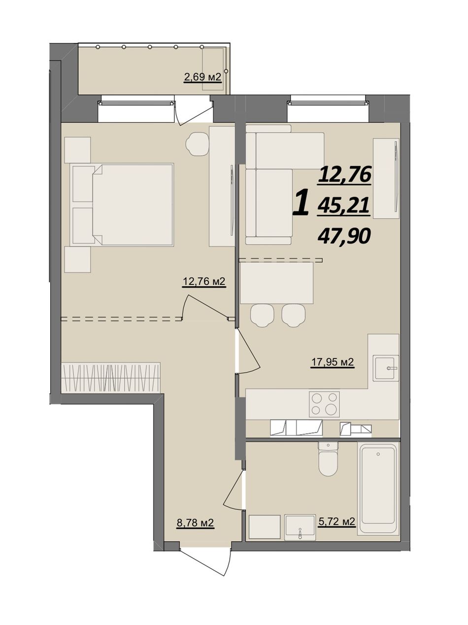1-комнатная — 47,9 м² 3/10 эт. в Азбука