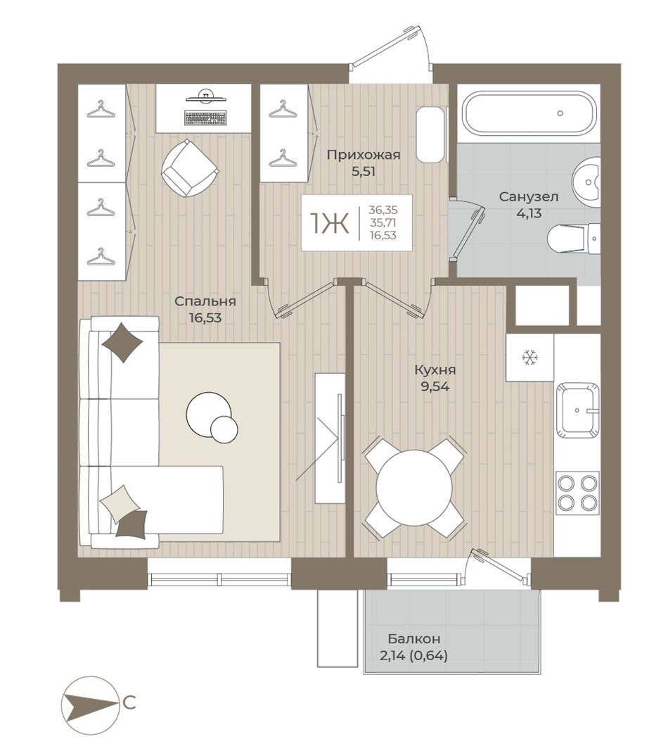 1-комнатная — 36,35 м² 4/15 эт. в АГАТ