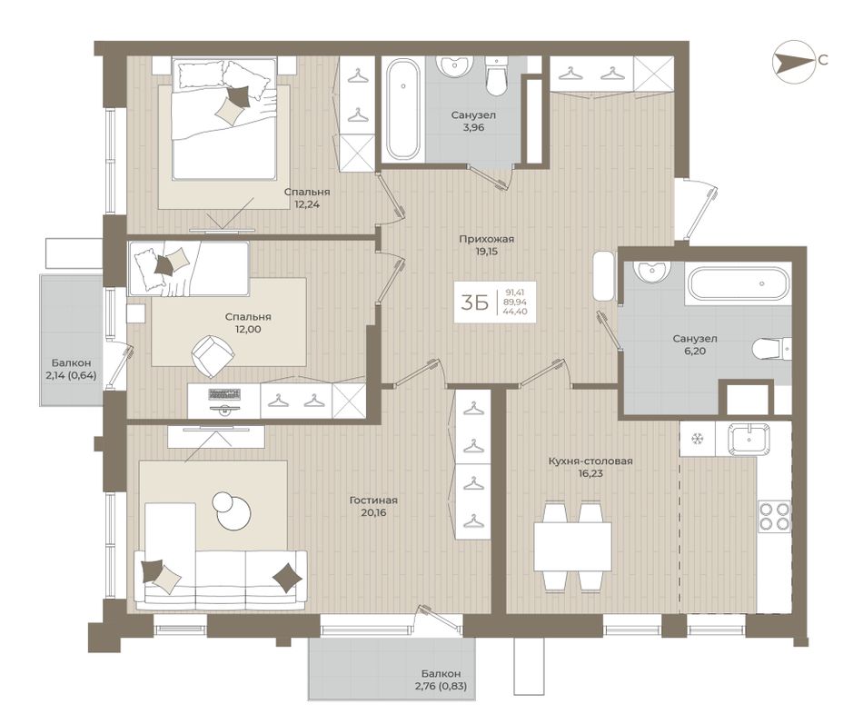 3-комнатная — 91,41 м² 4/15 эт. в АГАТ