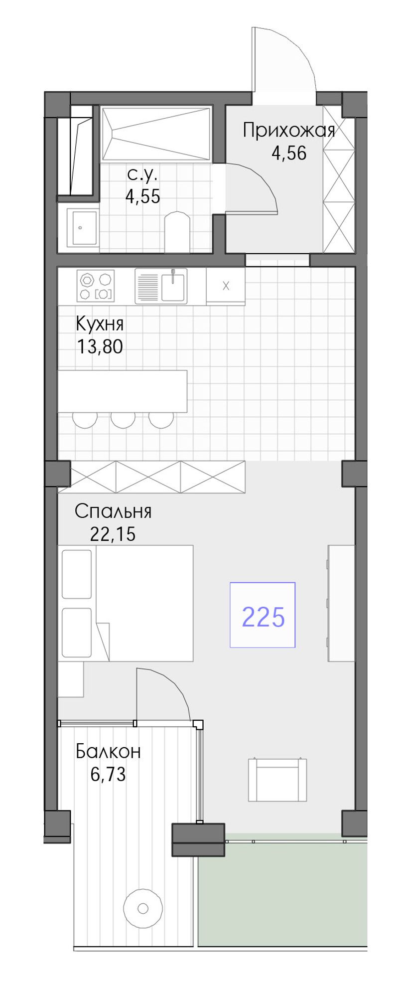 1-комнатная — 51,79 м² 2/13 эт. в Берий Палас