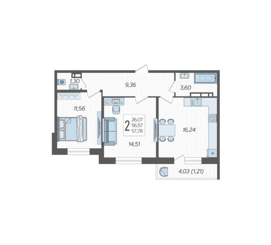 2-комнатная — 57,78 м² 1/12 эт. в Смородина