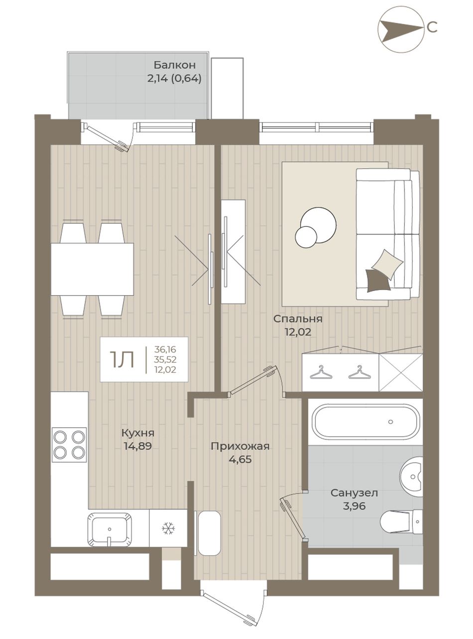 1-комнатная — 36,16 м² 10/15 эт. в АГАТ