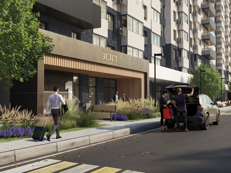 Стильный светлый фасад в сочетании с витражным остеклением и темной ламинацией на окнах создают потрясающий эффект! Подземный и отдельно стоящий паркинг, торговая галерея с магазинами, удобная локация.