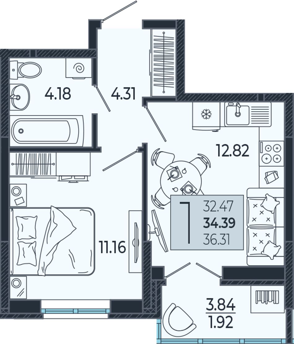 1-комнатная — 34,6 м² 3/21 эт. в Эстет