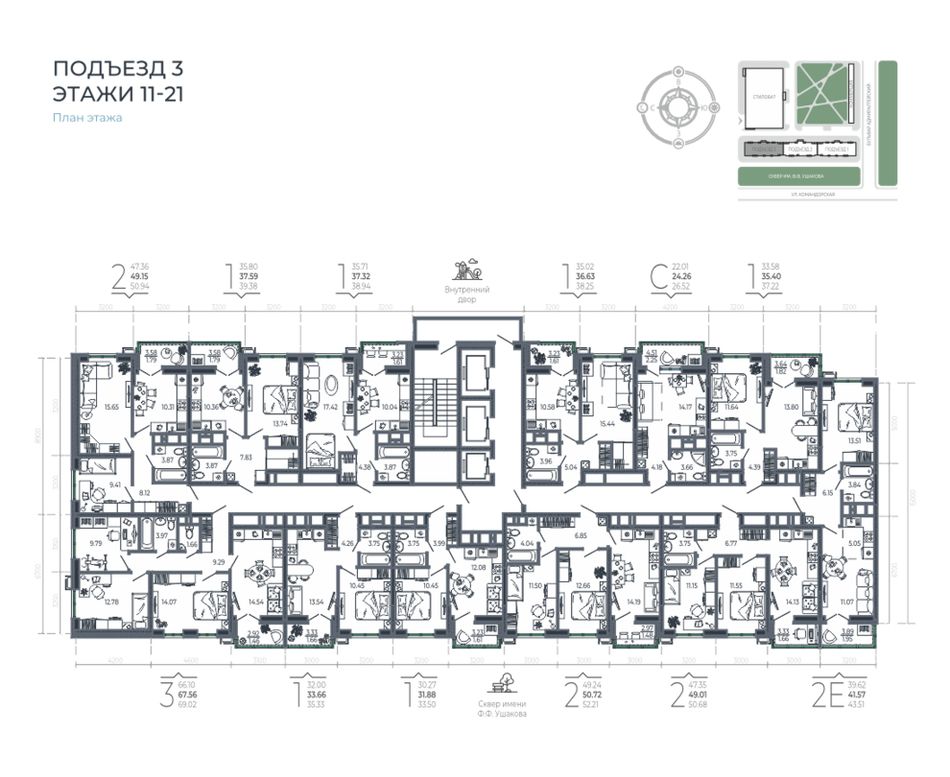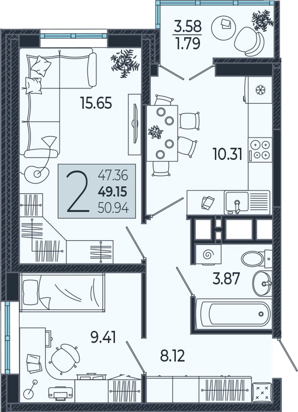 2-комнатная — 49,5 м² 21/21 эт. в Эстет