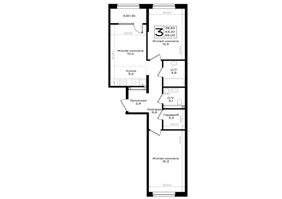 3-комнатная — 65 м² 2/18 эт. в Придонье