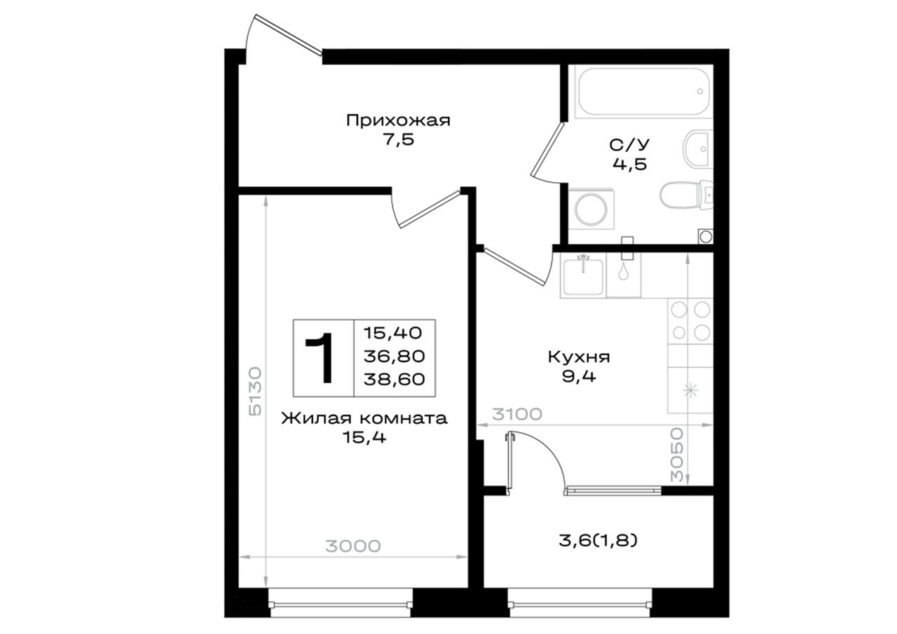 1-комнатная — 38,6 м² 2/18 эт. в Придонье