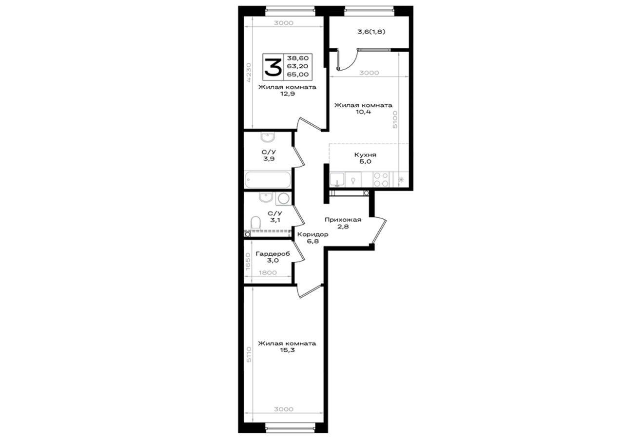 3-комнатная — 65 м² 2/18 эт. в Придонье