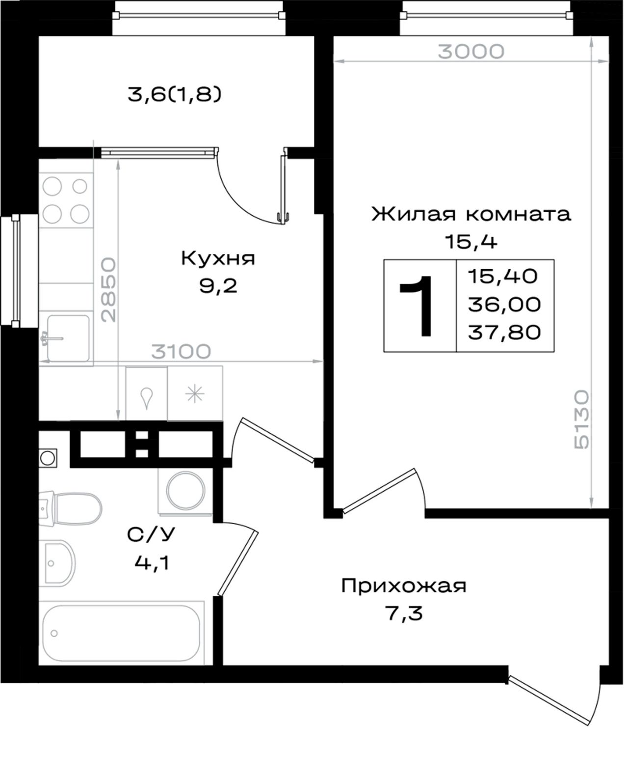 1-комнатная — 37,8 м² 13/18 эт. в Придонье