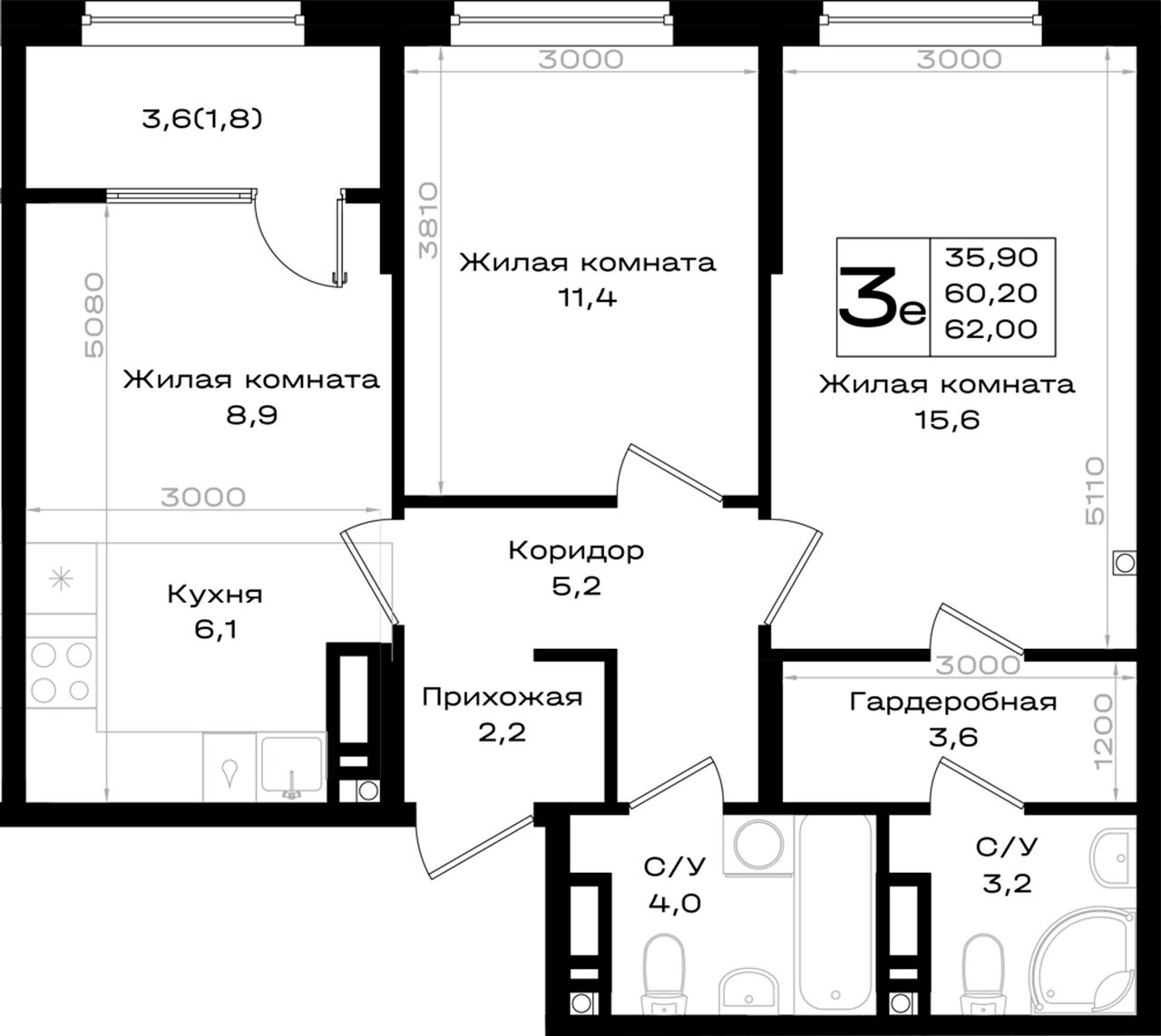 3-комнатная — 62 м² 16/18 эт. в Придонье