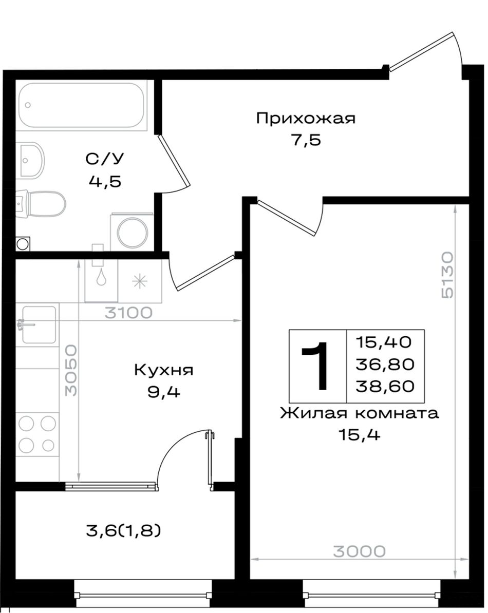 3. 1-комнатная, 38,6 м²