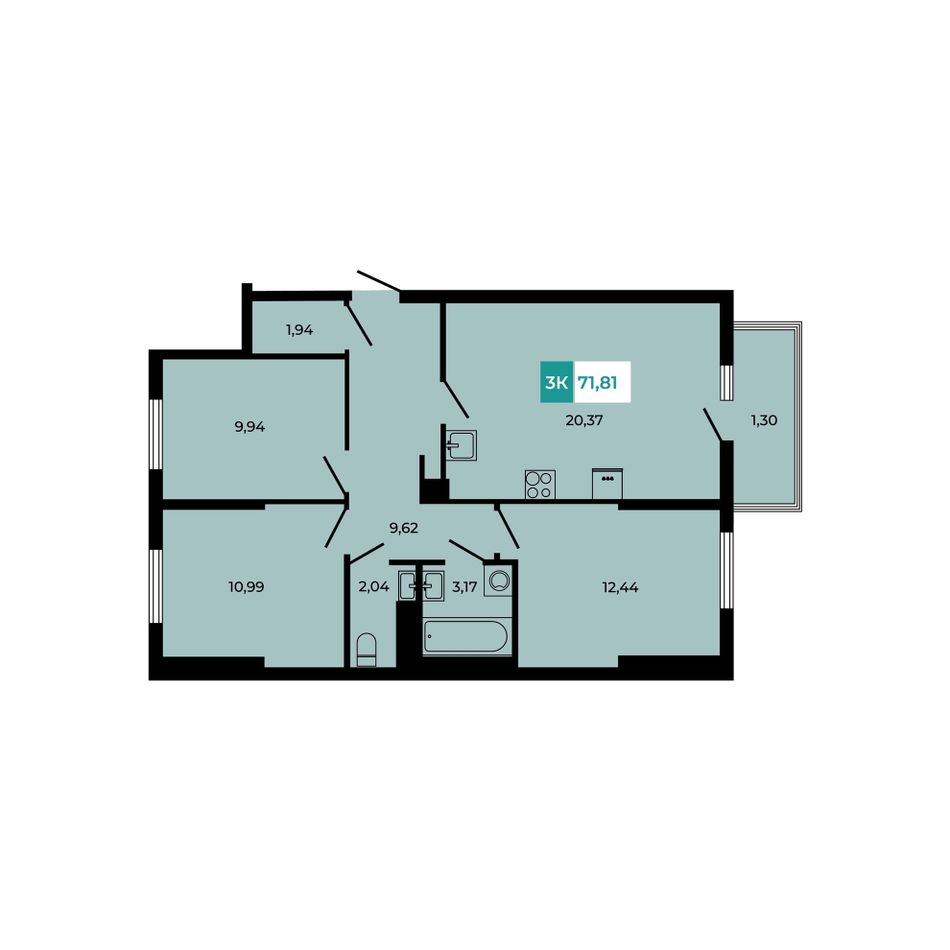 3-комнатная — 71,81 м² 8/8 эт. в Соседи