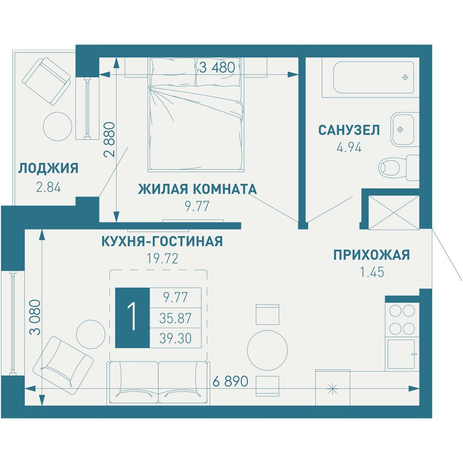 Общая площадь38,72 м²