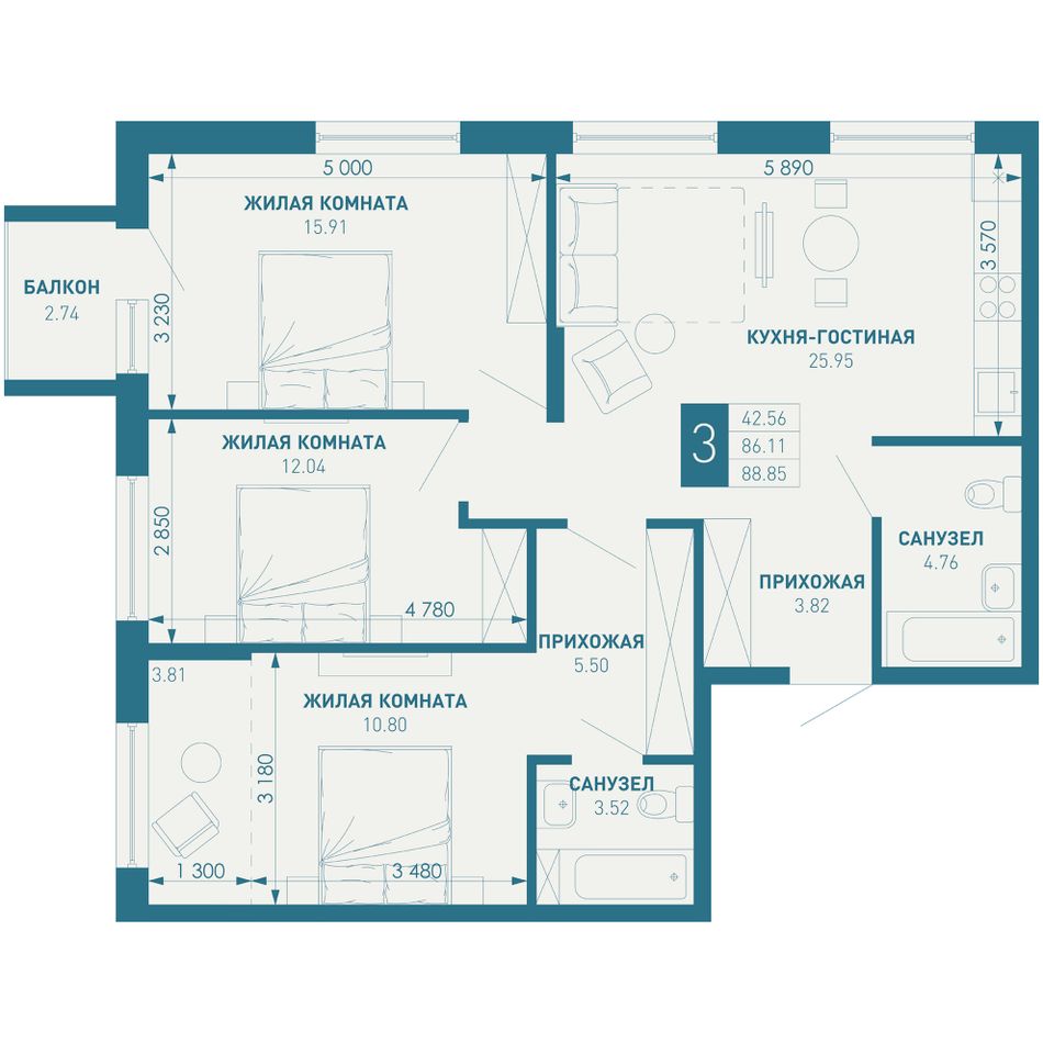 Общая площадь88,85 м²
