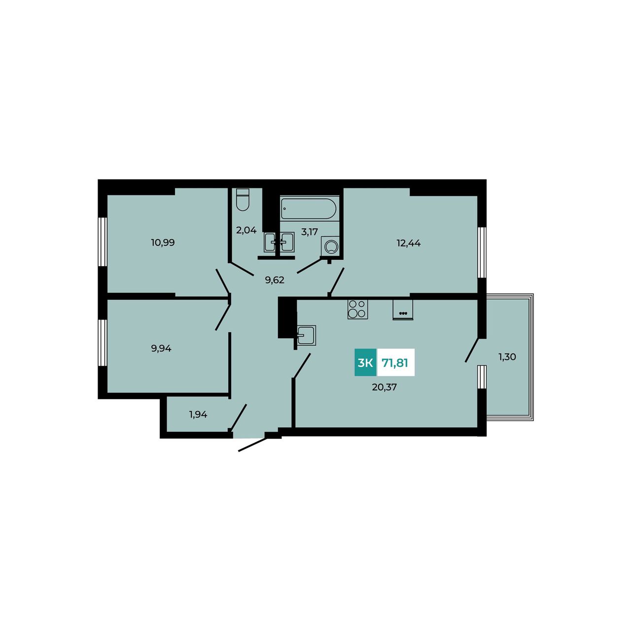 3-комнатная — 71,81 м² 3/8 эт. в Соседи
