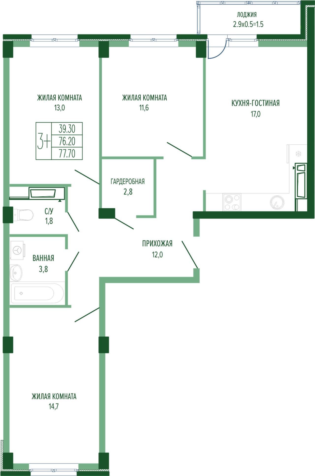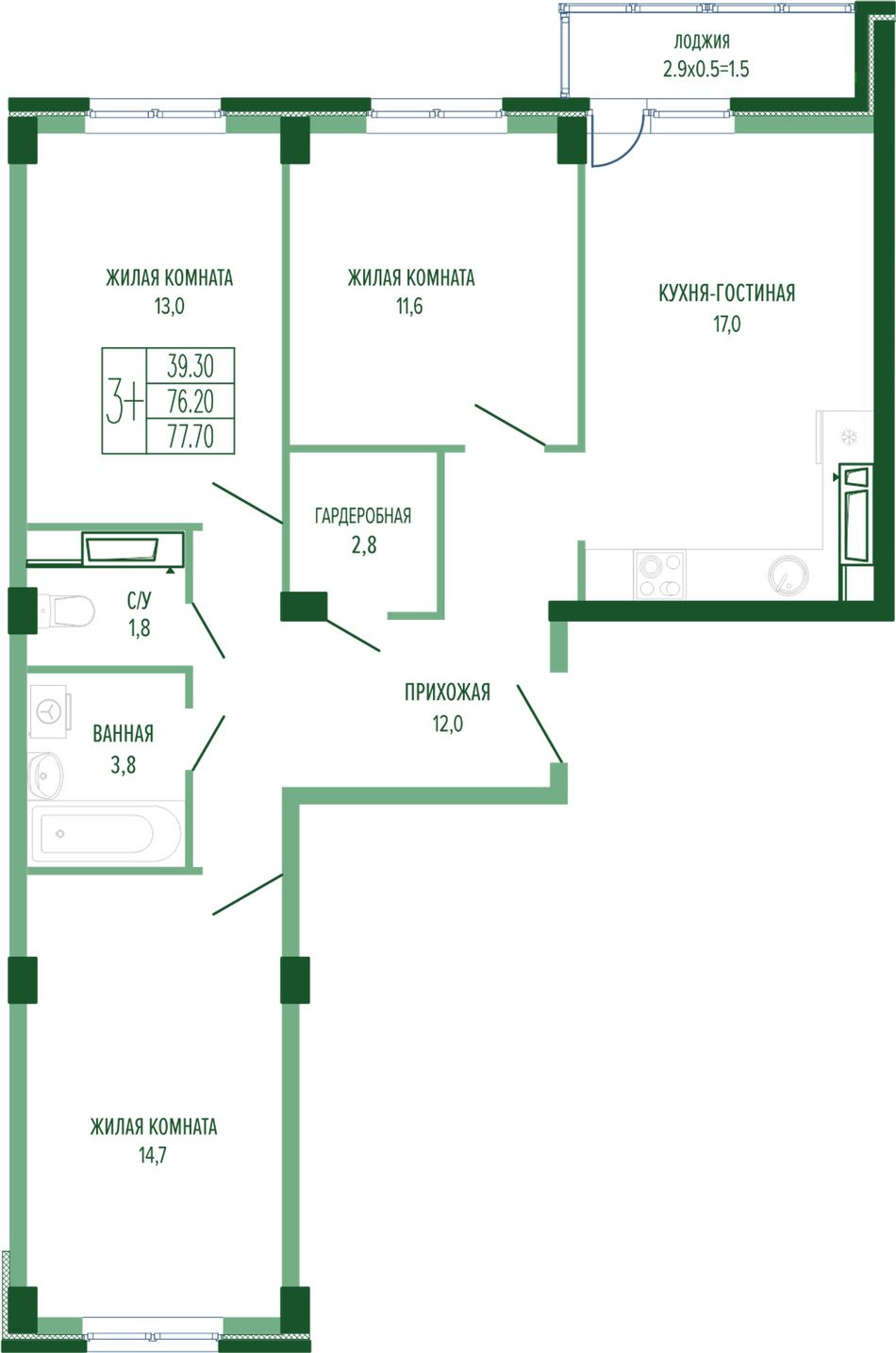 3-комнатная — 79,75 м² 5/5 эт. в Екатерининский парк