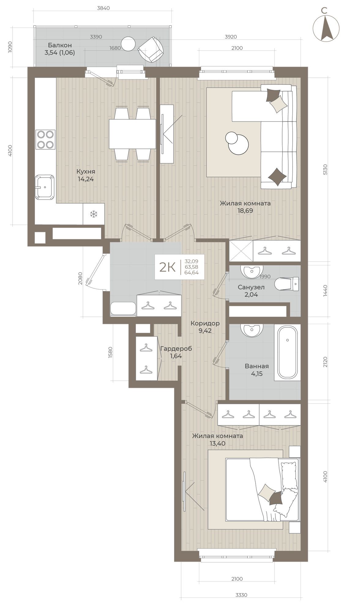 Общая площадь64,64 м²