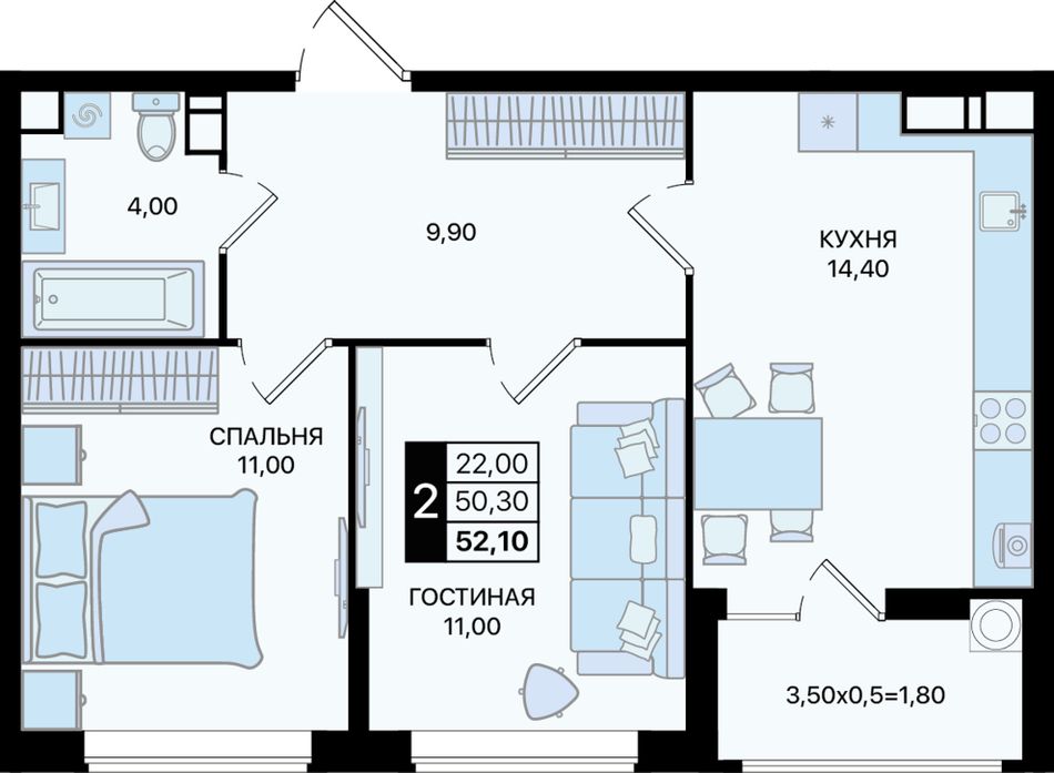 2-комнатная — 52,1 м² 9/20 эт. в Движение61