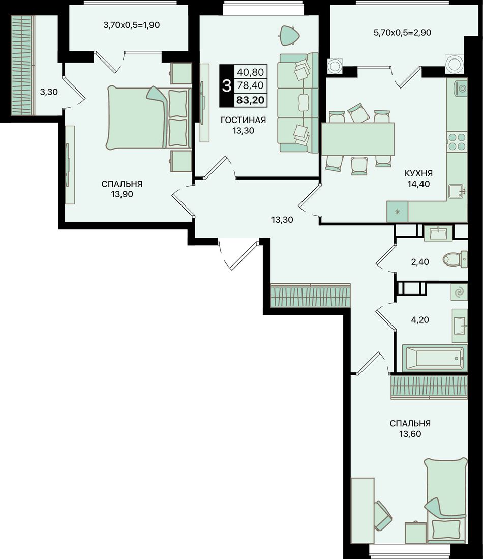 3-комнатная — 83,2 м² 8/20 эт. в Движение61
