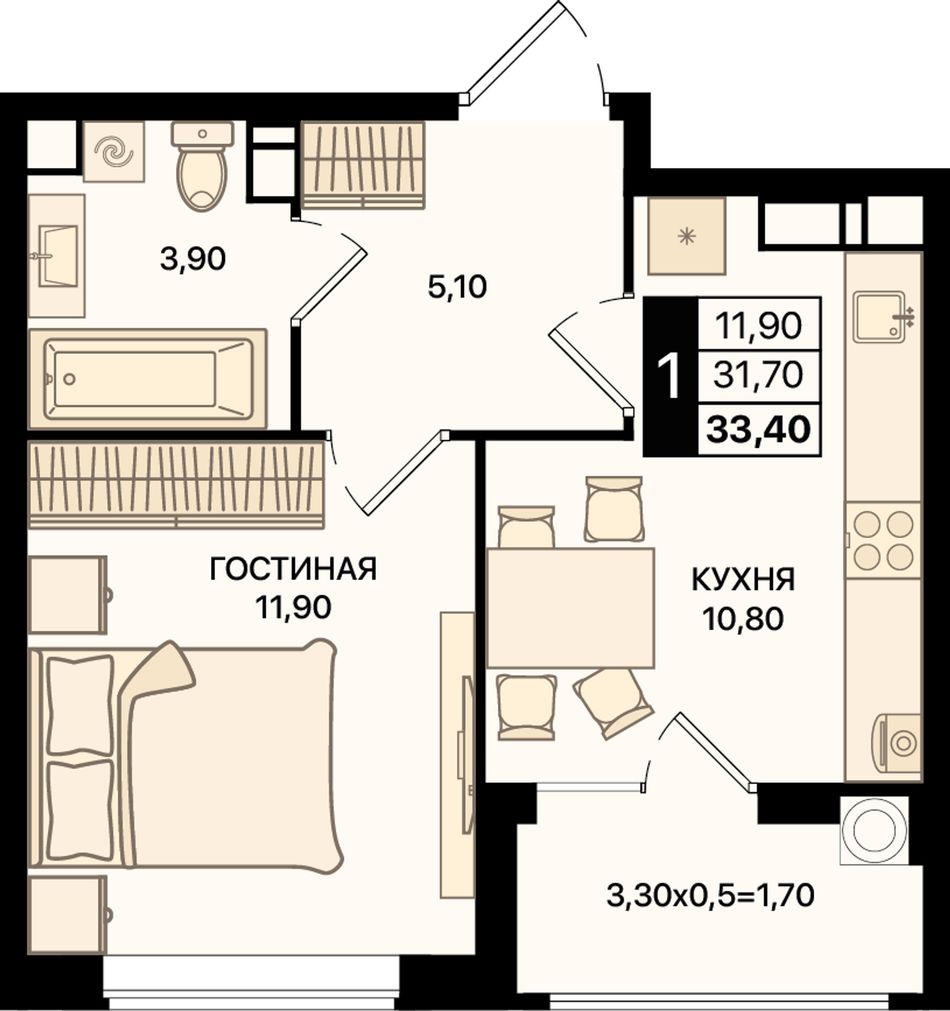 Общая площадь33,4 м²