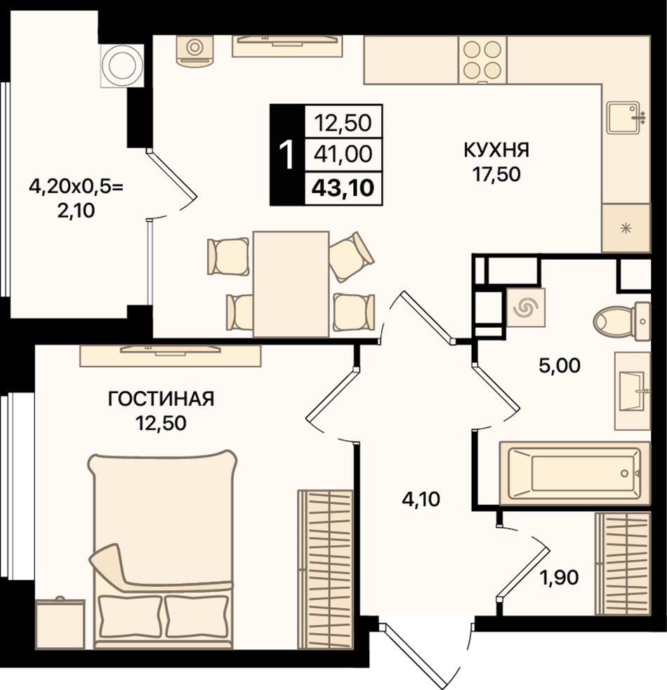 1-комнатная — 43,1 м² 5/20 эт. в Движение61