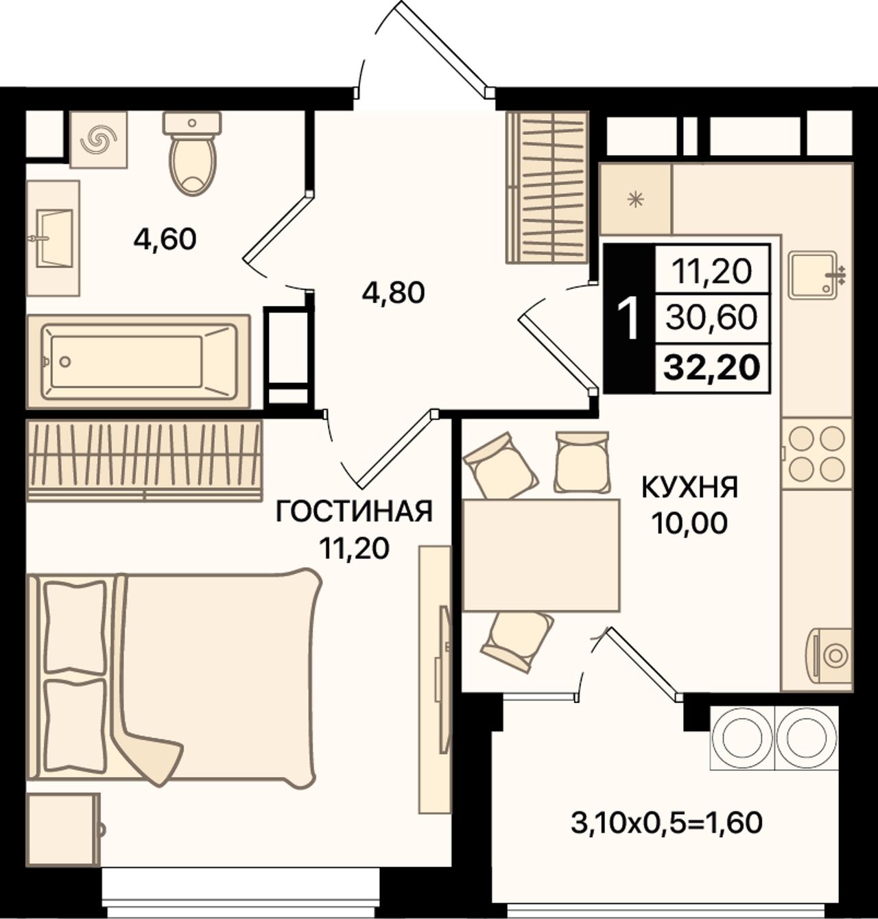 1-комнатная — 32,2 м² 17/20 эт. в Движение61