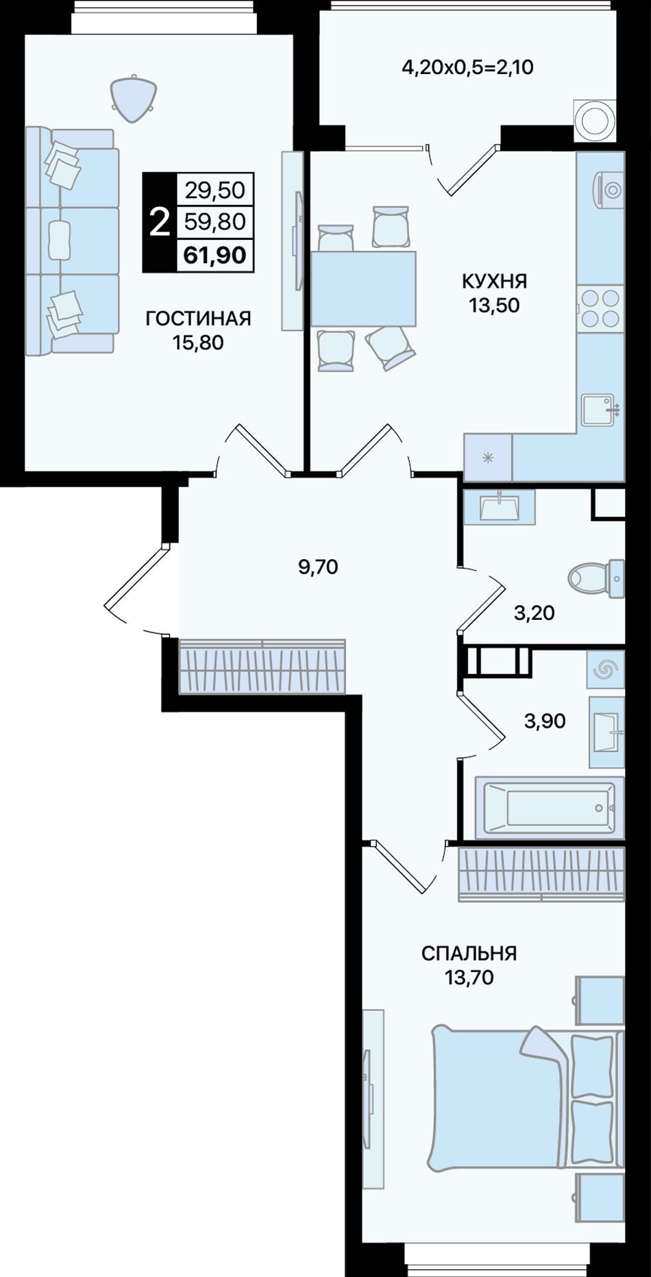 2-комнатная — 61,9 м² 5/20 эт. в Движение61