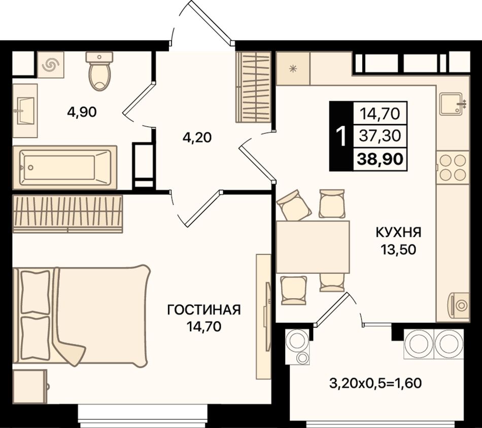 1-комнатная — 38,9 м² 16/20 эт. в Движение61