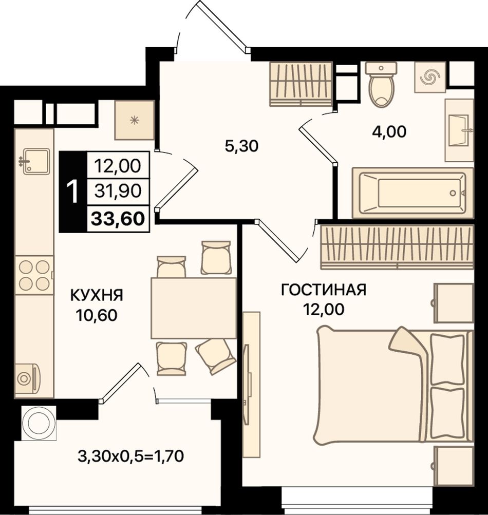 1-комнатная — 33,6 м² 9/20 эт. в Движение61