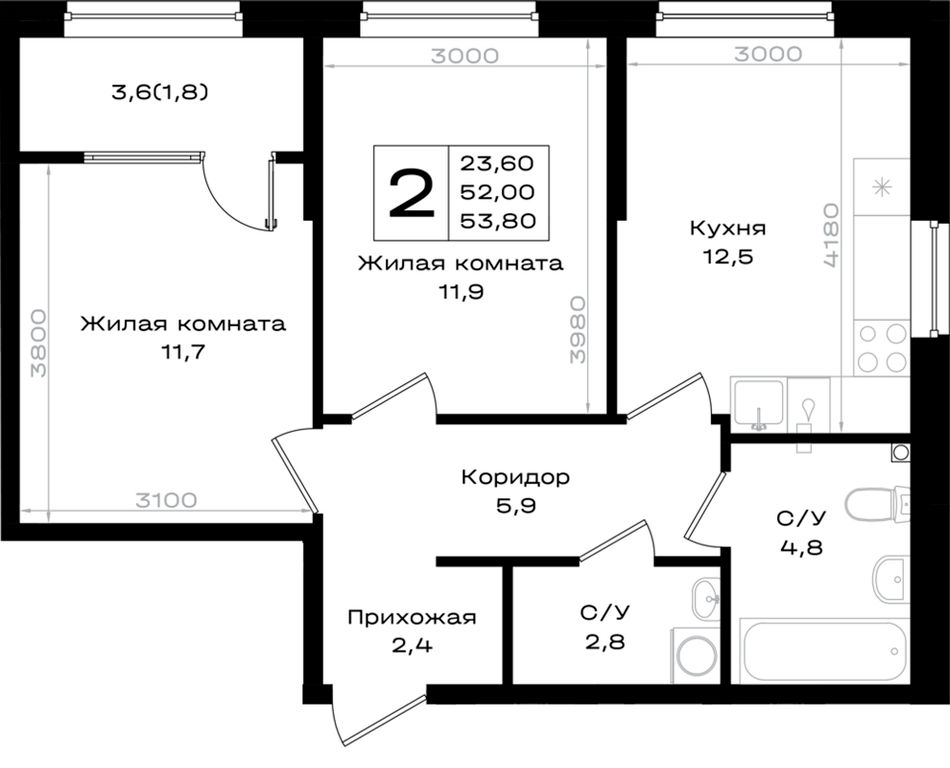 2-комнатная — 53,8 м² 2/18 эт. в Придонье
