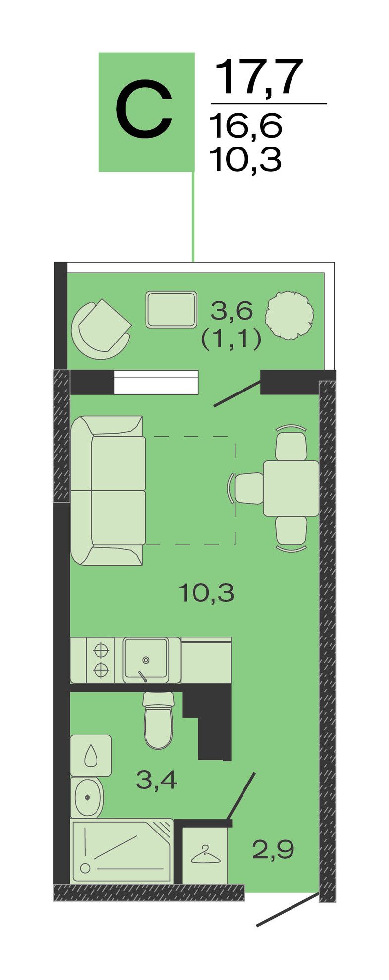 Студия — 17,7 м² 4/4 эт. в Дзенпарк