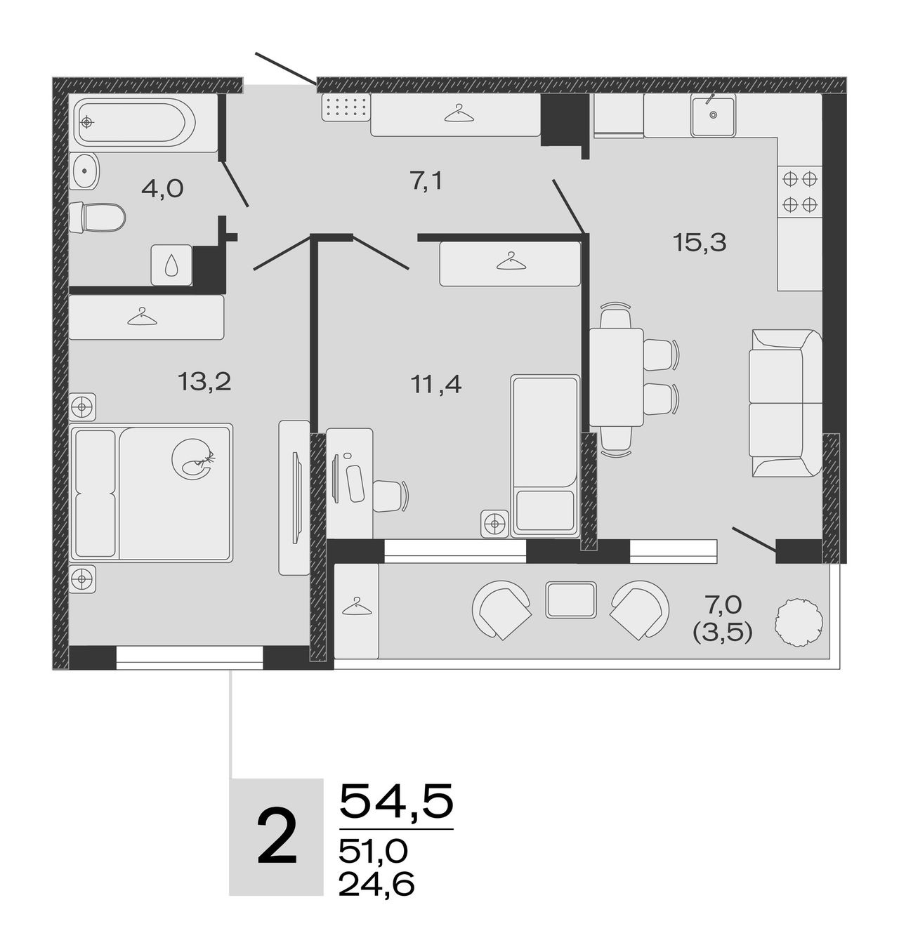 2-комнатная — 54,5 м² 1/4 эт. в Дзенпарк