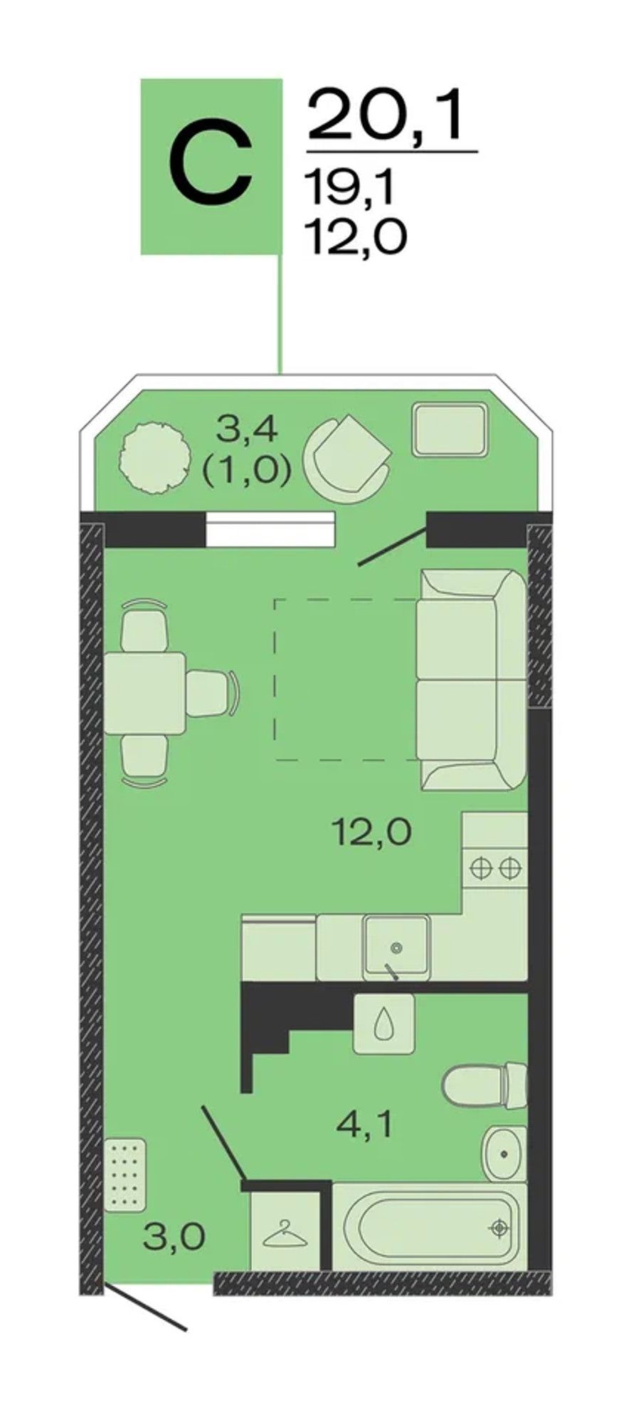 Студия — 20,1 м² 2/4 эт. в Дзенпарк