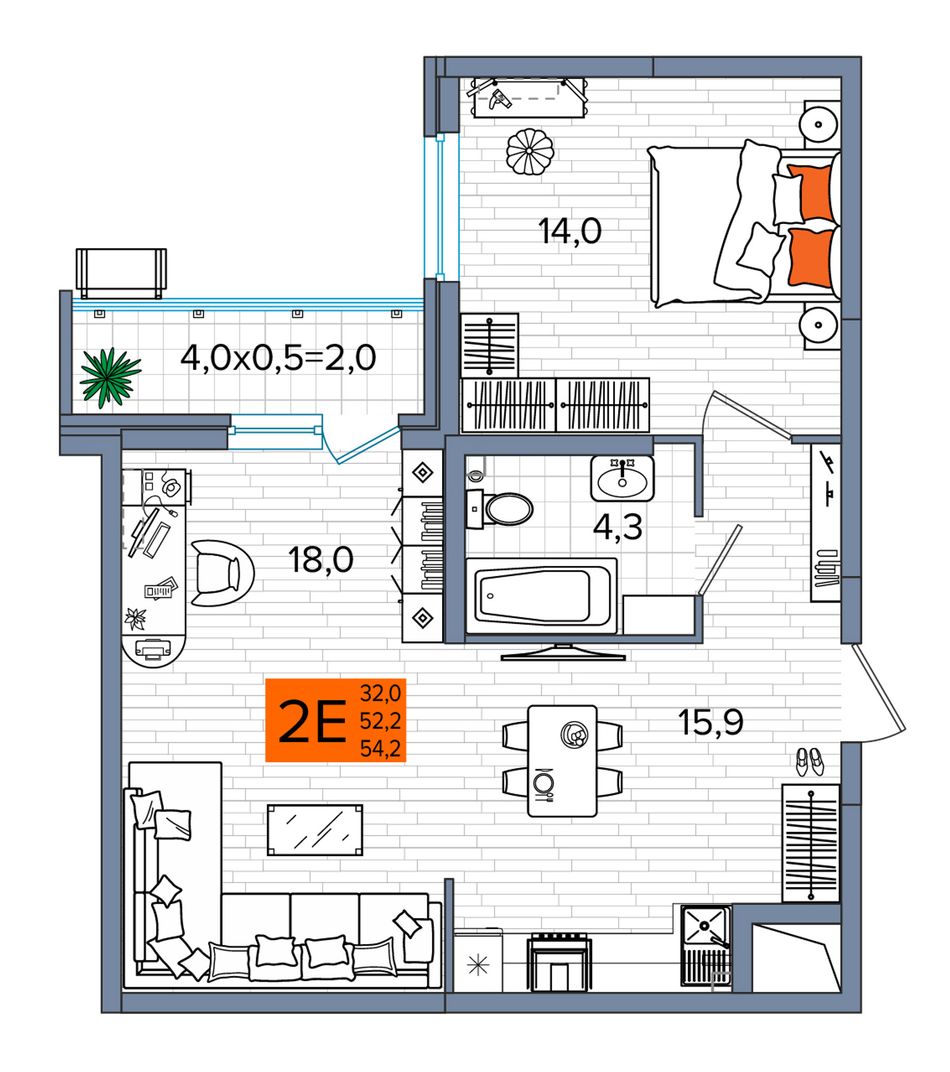 2-комнатная — 54,2 м² 2/16 эт. в Сармат