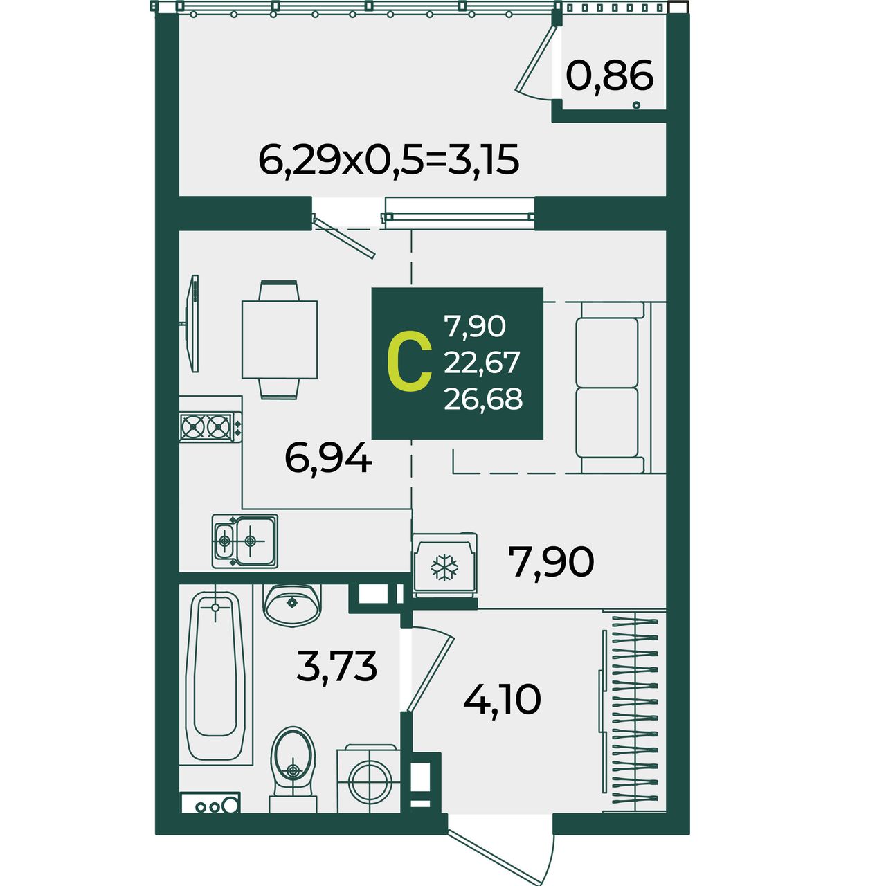 Общая площадь26,68 м²