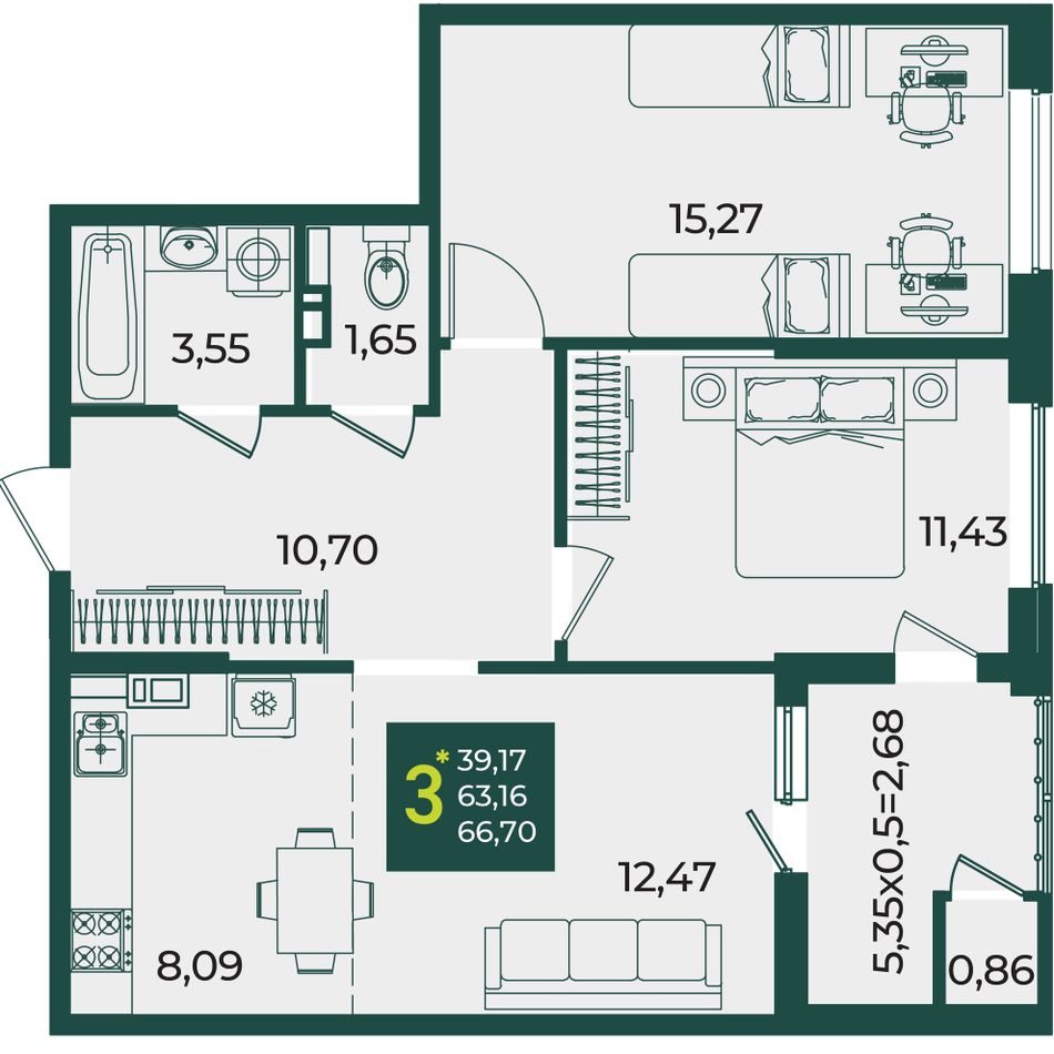3-комнатная — 66,7 м² 3/18 эт. в Образцово