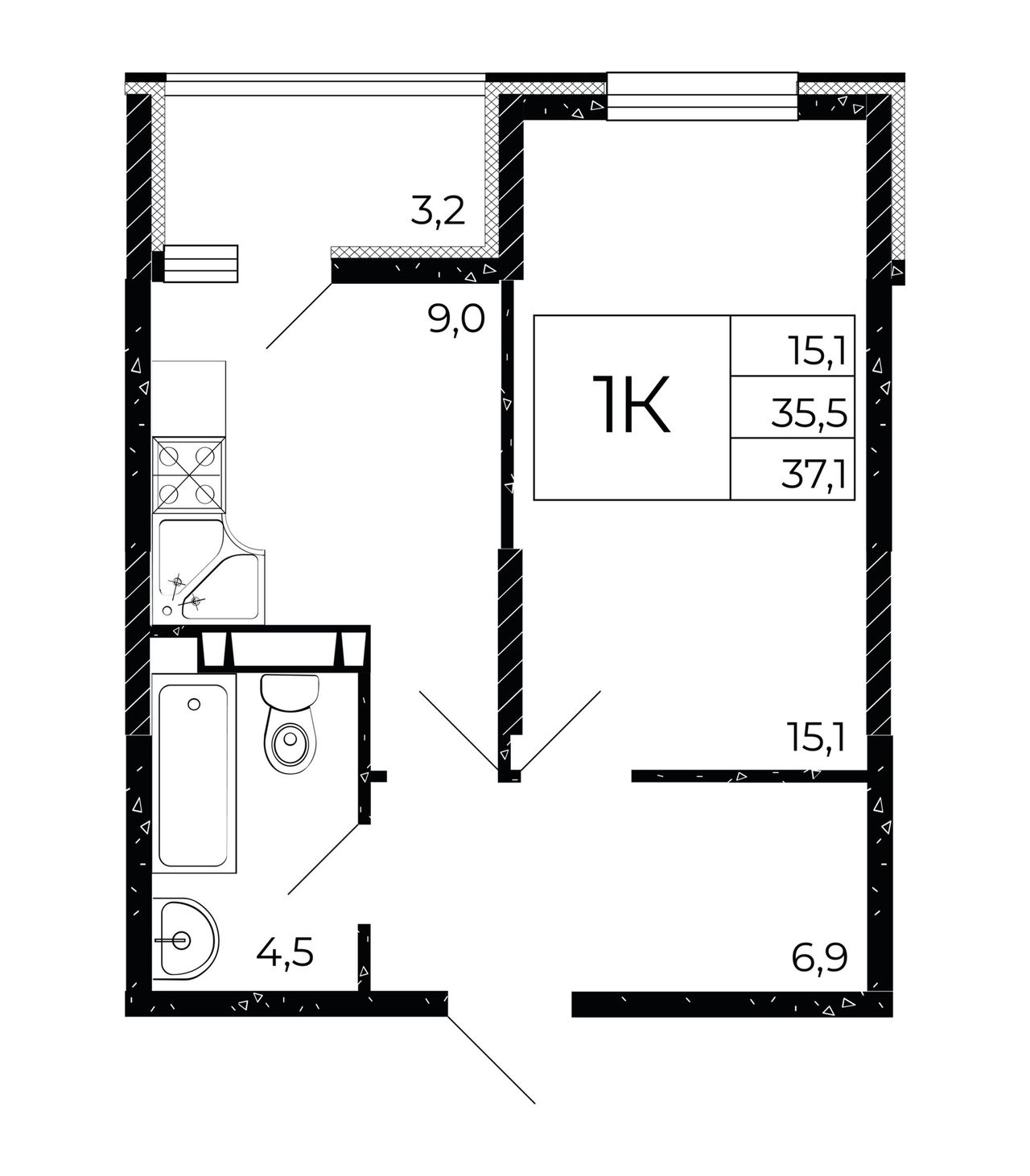 1-комнатная — 37,1 м² 8/15 эт. в Флора