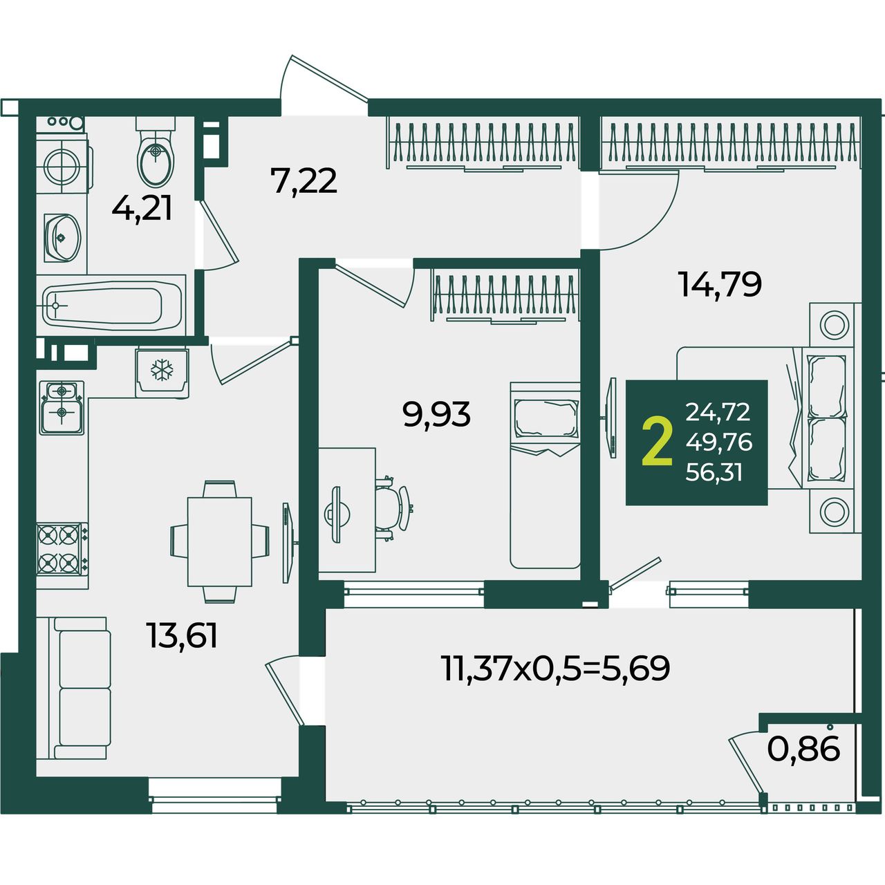 2-комнатная — 56,31 м² 4/18 эт. в Образцово