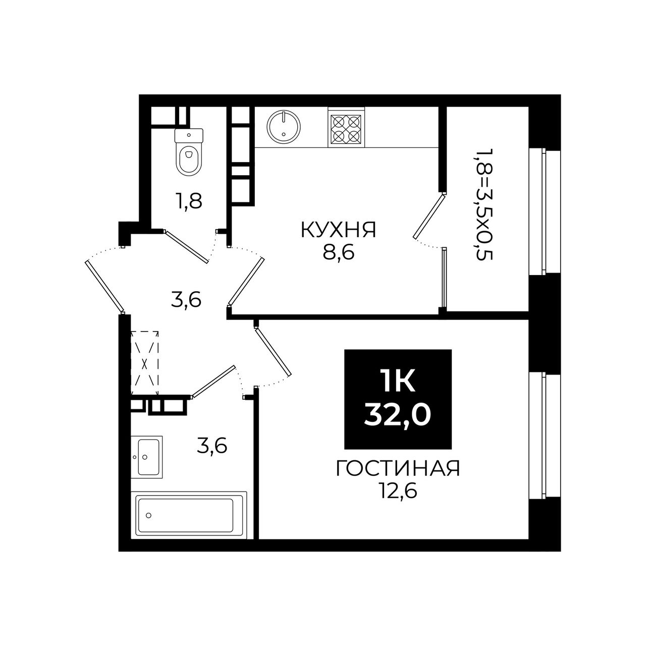 1-комнатная — 32 м² 18/24 эт. в Новый Ставрополь