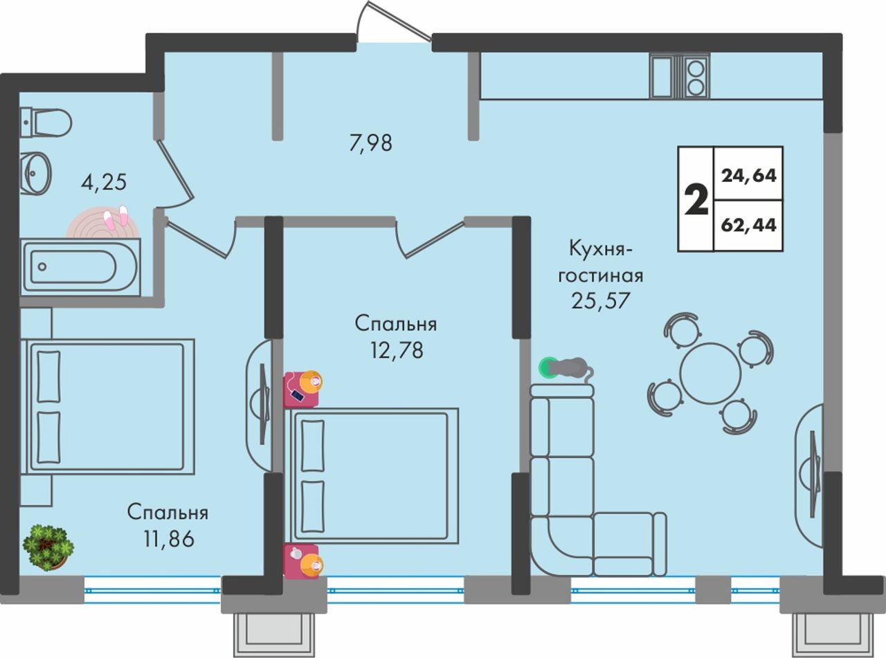 2-комнатная — 62,5 м² 5/9 эт. в Зелёная территория